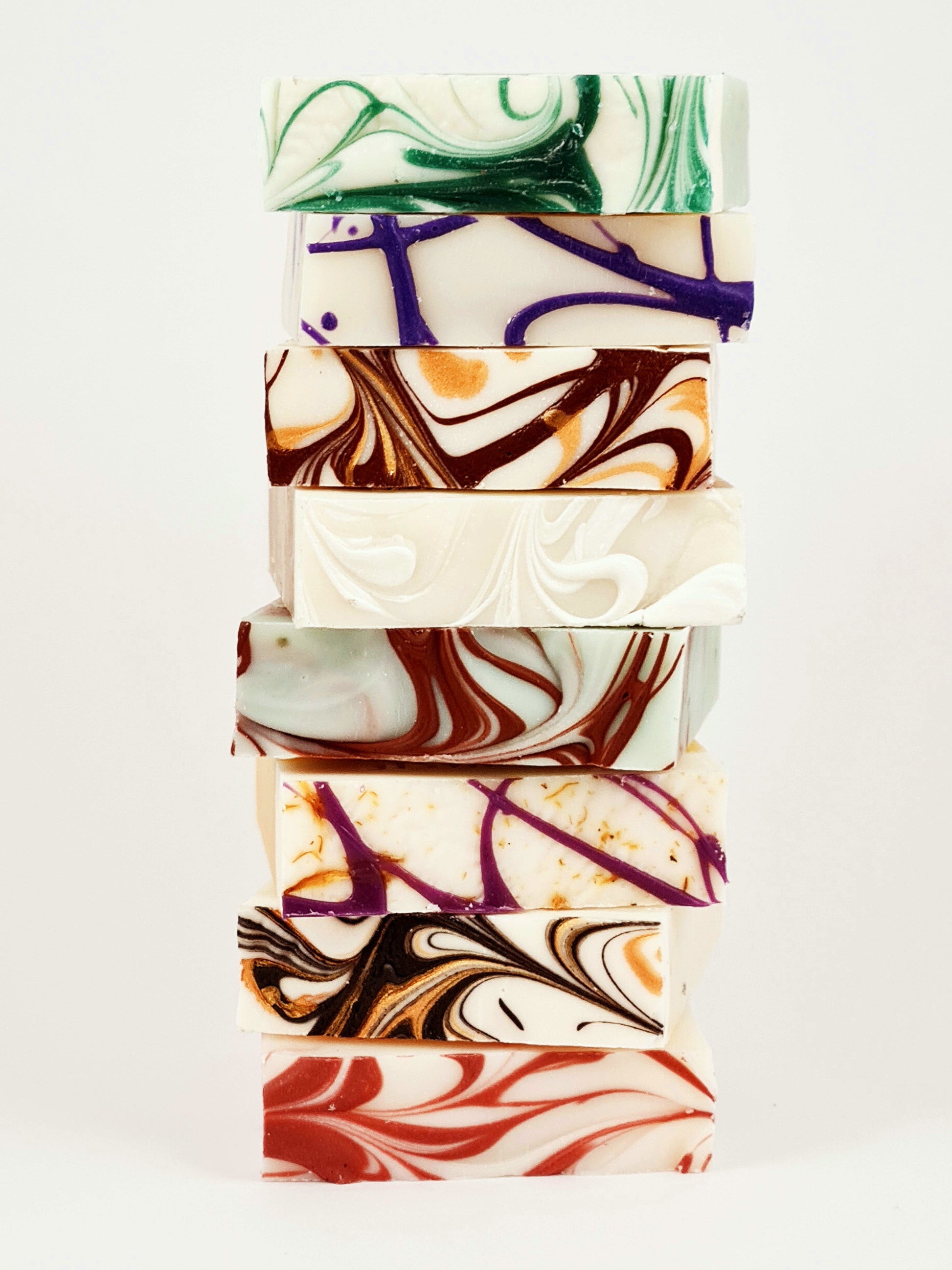 This Floral delicacy is a time proven favourite. Combining the skin balancing qualities of Floral Palma Rosa and Rose Geranium and patchouli, beautifully marbled and hand finished with Ground dried Rose Petals and a Luscious Paprika Mix.